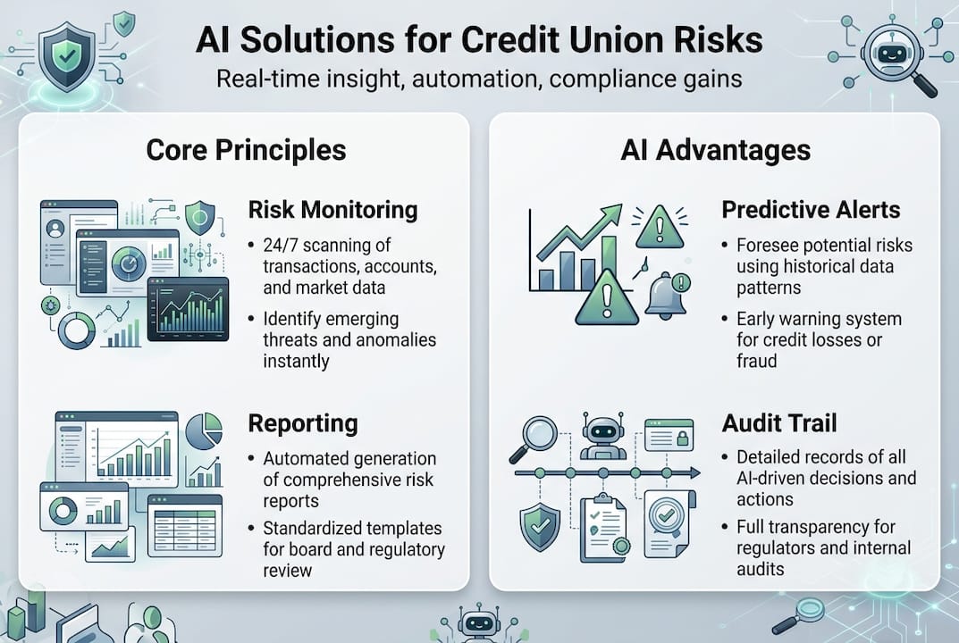 AI solutions enhance credit union risk management by delivering real-time KRI analysis, predictive risk detection, and automated compliance reporting, enabling faster decisions and more resilient portfolios.